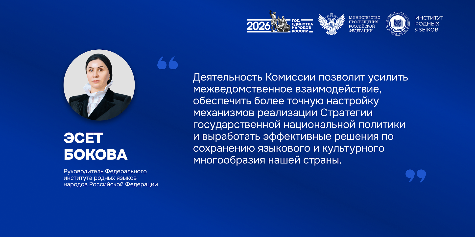 «Включение в состав Комиссии — это важная возможность для синхронизации экспертной, научной и практической повестки. Задачи, которые реализует Федеральный институт родных языков в тесном взаимодействии с Минпросвещения России, напрямую соответствуют приоритетам государственной национальной политики. Речь идёт о системной поддержке родных языков, развитии этнокультурного образования, укреплении научно-методической базы и кадрового потенциала», — отметила Эсет Ибрагимовна.